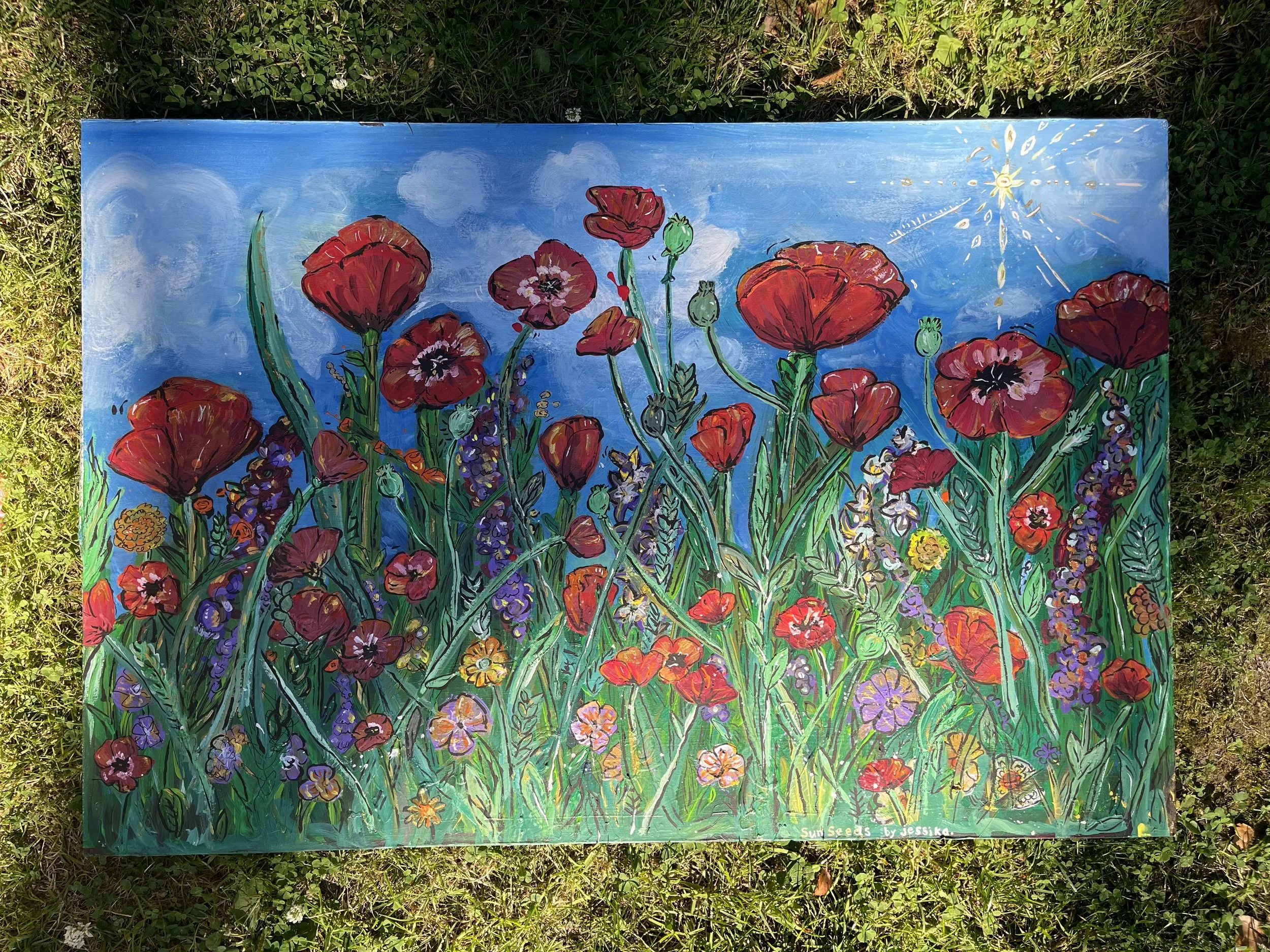 Life is more than just a filed of flowers. It’s the sun-seeds, leaves, insects, blue skies, and the bare-feet that walk within it. Painting by Jess.